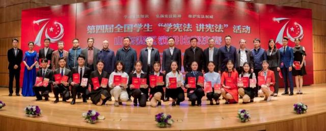 下午的決賽現場,氣氛緊張。16名選手提前3分鐘隨機抽取題目,進行即興命題演講。經過激烈角逐,決賽分別決出高校組特等獎1名、一等獎6名、二等獎9名。煙臺大學的傅于說,從歷史事件入手,以真摯的情感,講述為什么要堅持黨的領導和中國特色社會主義制度以及憲法對此的規定,從歷史和現實的角度、根本大法的高度加深了大家對中國共產黨領導是中國特色社會主義最本質特征的理解和遵守憲法的自覺,獲得特等獎。來自山東政法學院、濰坊理工學院、山東水利職業學院、曲阜師范大學、山東科技大學、山東科技職業學院的六位選手獲得一等獎。來自山東青年政治學院、濟南大學、山東司法警官職業學院、青島職業技術學院、山東師范大學、青島農業大學海都學院、山東工商學院、中國海洋大學、山東華宇工學院的九位選手獲得二等獎。