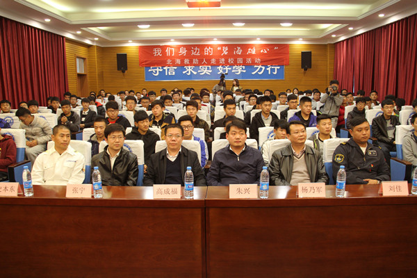 伴隨著《碧海雄心》片花中一幕幕生死一線的救助場景,來自北海救助局的救助船長、救助機長和救助潛水員代表,分別結合自己的親身經歷,與同學們分享了從踏進救助行業以來,不忘為民初心,牢記救助使命,一步步成長為我局救助骨干力量的心路歷程,講述了在風口浪尖上奮勇向前,沖在第一線,在驚濤駭浪中挽救生命的感人故事,生動詮釋了北海救助人忠誠踐行海上“德政工程”,“把生的希望送給別人,別死的危險留給自己”的救撈精神,贏得了同學們的陣陣掌聲。
