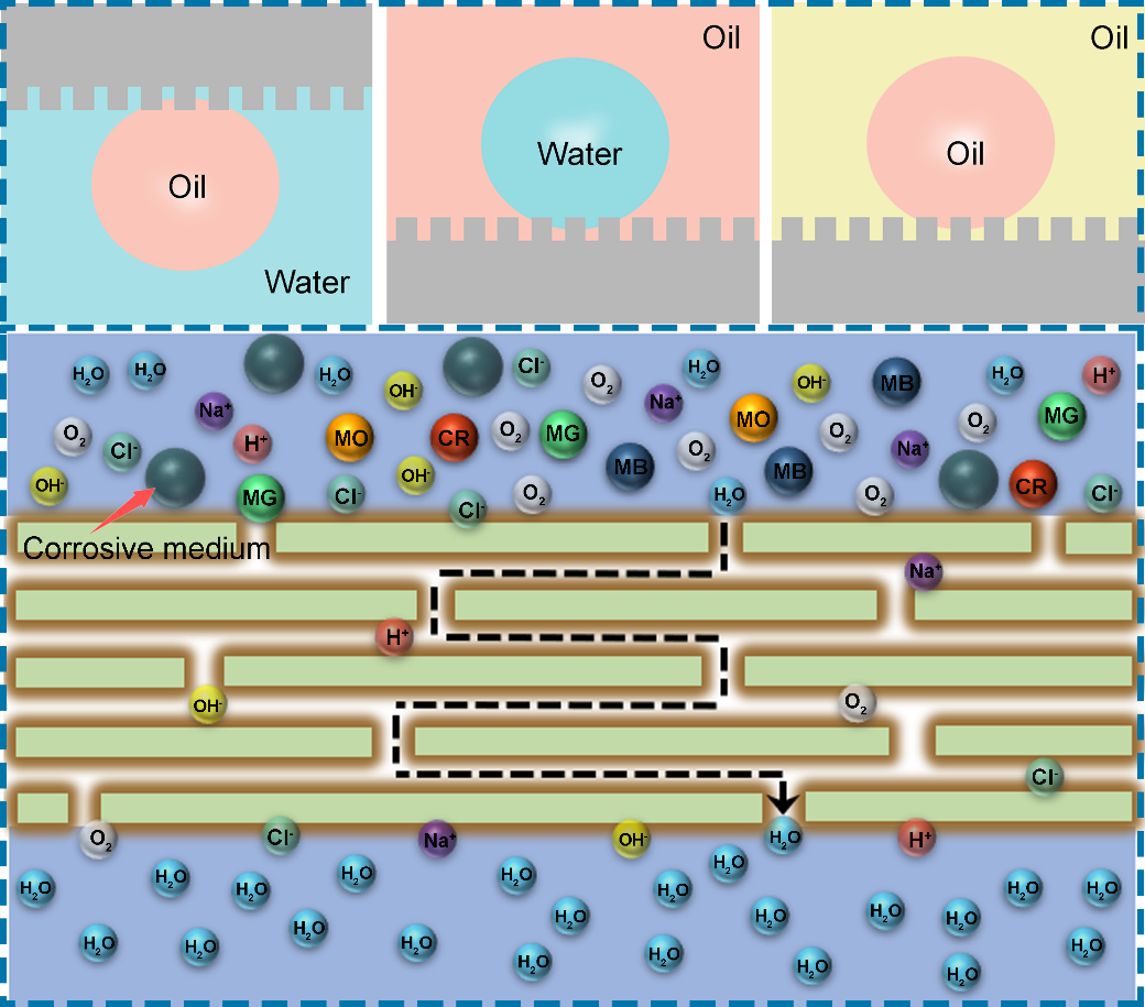 GO/PDA涂層的浸潤性能及其層狀結(jié)構(gòu)阻隔染料分子及腐蝕介質(zhì)的示意圖