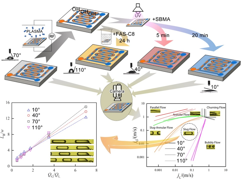 近日,化學化工學院趙玉潮教授團隊利用等離子體輔助接枝改性,將甲基丙烯酰乙基磺基甜菜堿(SBMA)及1H,1H,2H,2H-全氟癸基三乙氧基硅烷接枝于聚甲基丙烯酸甲酯(PMMA)材料表面,制作了表面接觸角不同的微通道,深入研究了其對氣-液兩相流動與氣泡形成過程的影響規律,為微通道反應器的個性化設計提供了基本科學數據。