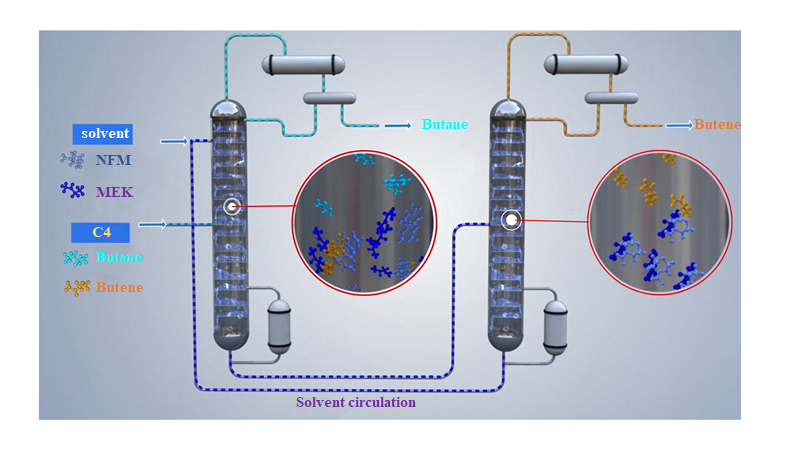 化學化工學院碳四團隊在原有碳四分離技術基礎之上,開展了相關節能技術研究。團隊將絡合萃取及加入到常規碳四分離萃取劑中,對混合碳四加鹽絡合萃取精餾過程進行了系統研究。結果表明,加入絡合萃取劑可顯著提高混合碳四組分間的相對揮發度,加鹽絡合萃取精餾工藝比傳統萃取精餾工藝節能30%以上,該研究為碳四分離提供了一條高效節能的新途徑。