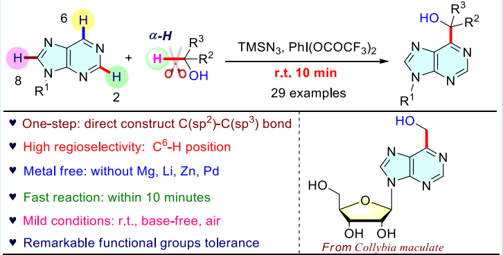 鑒于嘌呤和嘌呤核苷化合物的重要生物活性,近日,我校化學化工學院孫凱課題組和魯東大學于明武老師團隊合作,利用PIDA/TMSN3氫原子轉移體系,共同開發了一種高度區域選擇性的羥烷基化反應,在10分鐘內可以合成系列C6-羥基烷基化嘌呤和嘌呤核苷。該研究成果發表于美國化學會的有機快報(Org. Lett., 2022, DOI:10.1021/acs.orglett.2c01680)。