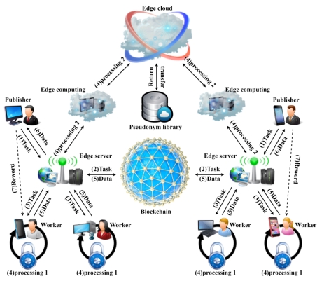該團隊創(chuàng)新性地提出了一種基于邊緣計算和區(qū)塊鏈技術(shù)的三重實時軌跡隱私保護(hù)機制(T-LGEB)應(yīng)用于MCS。其系統(tǒng)體系結(jié)構(gòu)如圖1所示。首先,使用本地化差分隱私技術(shù)和基于高斯分布的多概率延伸機制來處理任務(wù)參與者當(dāng)前的真實位置,并且任務(wù)參與者將使用處理后的位置進(jìn)行數(shù)據(jù)上傳和假名服務(wù)請求。然后,通過本文提出的基于邊緣計算的時空動態(tài)假名機制,將任務(wù)參與者的整個軌跡劃分為多個具有不同假名身份的無關(guān)軌跡段。最后,在MCS中引入?yún)^(qū)塊鏈技術(shù),使用區(qū)塊鏈代替?zhèn)鹘y(tǒng)第三方平臺能夠有效解決不可信第三方平臺造成的隱私泄露問題。通過對多個真實數(shù)據(jù)集進(jìn)行大量實驗和對比分析,證明了提出的T-LGEB具有極高的隱私保護(hù)能力和數(shù)據(jù)可用性,并且所造成的資源消耗也相對較低。