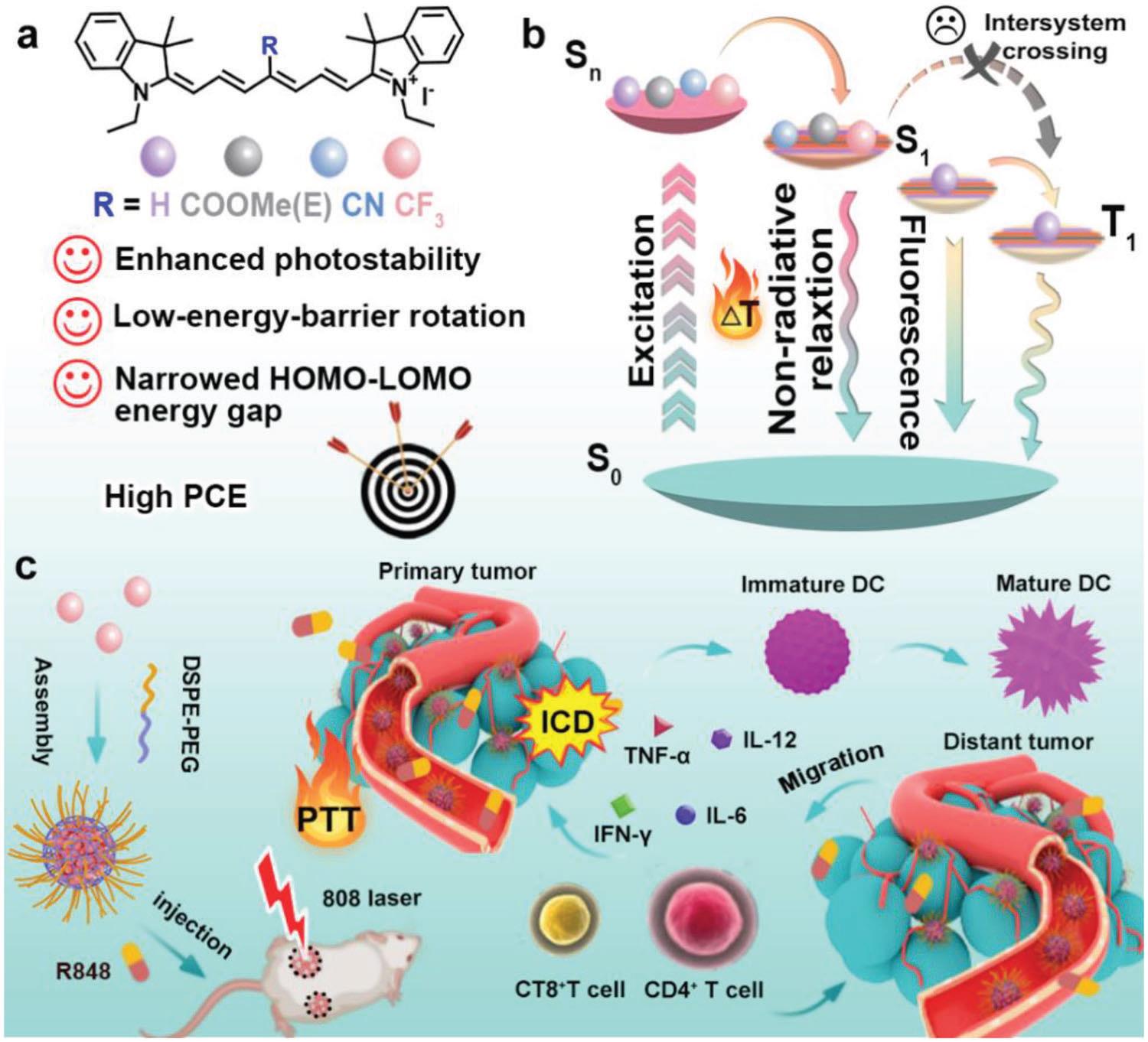 轉移瘤的發生是臨床癌癥治療失敗和患者死亡的主要原因。光熱免疫治療是一種非侵襲性、易誘導免疫原性的高效癌癥治療策略。因此,通過結構修飾改性增強染料分子的非輻射能量躍遷以提高光熱轉換效率成為研究重點。
