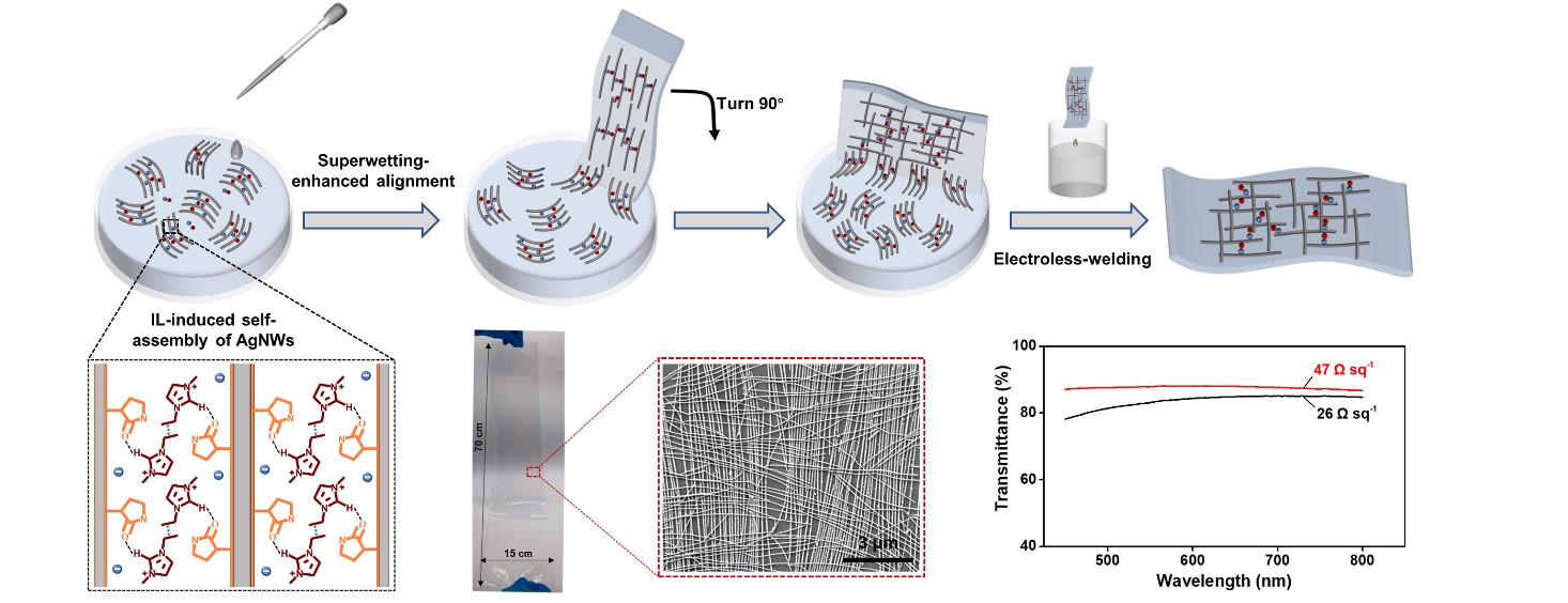 基于此,煙臺大學化學化工學院劉洪亮教授團隊通過超浸潤誘導轉(zhuǎn)移法將離子液體(1-乙基-3-甲基咪唑(雙三氟甲烷磺酰)亞胺)和銀納米線組成的自組裝復合物轉(zhuǎn)移到可拉伸基底上,成功制備了大面積、可拉伸、有序的銀納米線電極。在此基礎(chǔ)上,使用化學焊接進一步降低銀納米線之間的接觸電阻。制備的可拉伸透明電極具有26-46 Ω sq-1的低薄層電阻,在550納米波長下具有84%-88%的高透光率。基于這種可拉伸透明電極的透明加熱設(shè)備具有優(yōu)異的電加熱性能和拉伸穩(wěn)定性。這項研究為制備新一代可拉伸設(shè)備所需的高性能大面積、可拉伸透明電極提供了一種新方法。