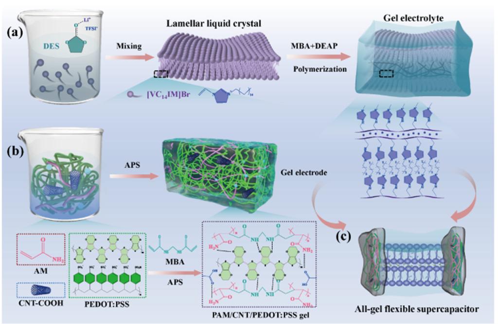 近日,煙臺大學化學化工學院科研人員發表研究成果:一種有序離子液晶電解質并用于全柔性超級電容器的構筑。將兩親性離子液體和低共熔溶劑的獨特性質與液晶中高度有序的微觀結構相結合,即以無序的離子液體作為組裝基元,在低共熔溶劑介質中通過自組裝形成有序的液晶結構,選擇具有高度取向結構的層狀液晶作為基體,通過光引發聚合交聯,將液晶的取向結構鎖定,進而成功制得具有取向結構的凝膠電解質,其中相分離產生的親水層或離子層形成界限清晰的離子通道,實現了離子的快速傳輸。無需使用額外的可伸縮襯底或隔膜,與凝膠電極組裝形成全凝膠柔性器件,極大減弱了電極與電解質的界面電阻。這種新穎的結構組成、簡單的構筑方法、穩定的機械性能以及優良的電化學性能使柔性超級電容器具有真正可穿戴應用的前景。