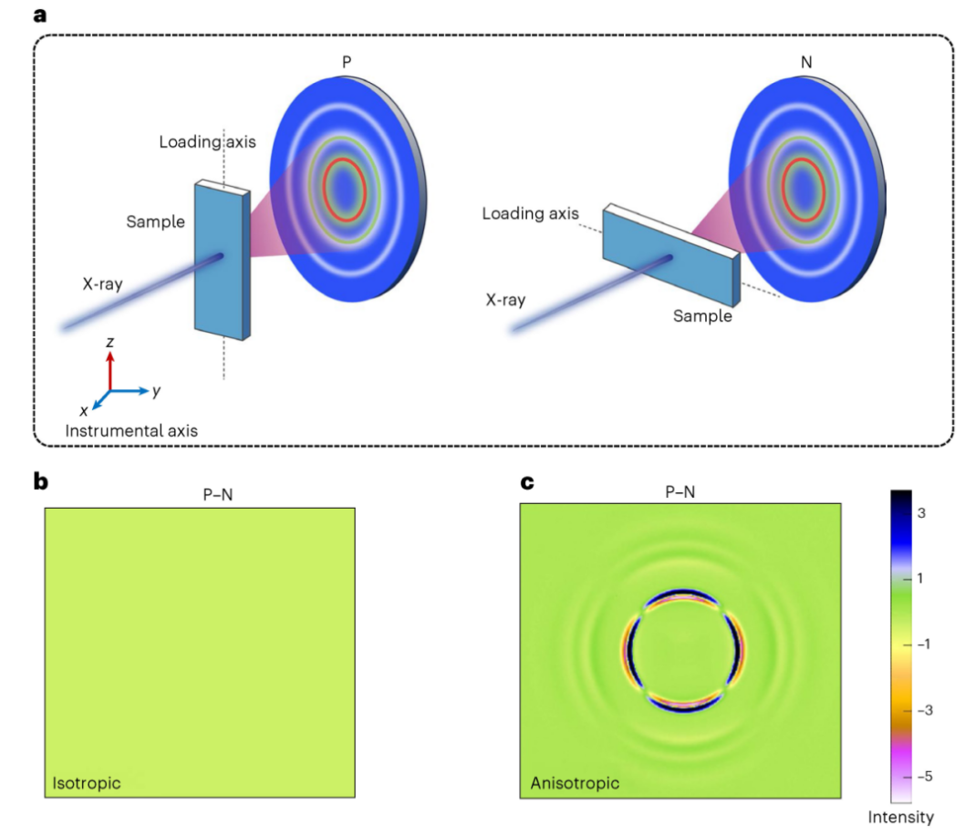 上圖為同步輻射測量和分析變形非晶材料中的結(jié)構(gòu)各向異性。