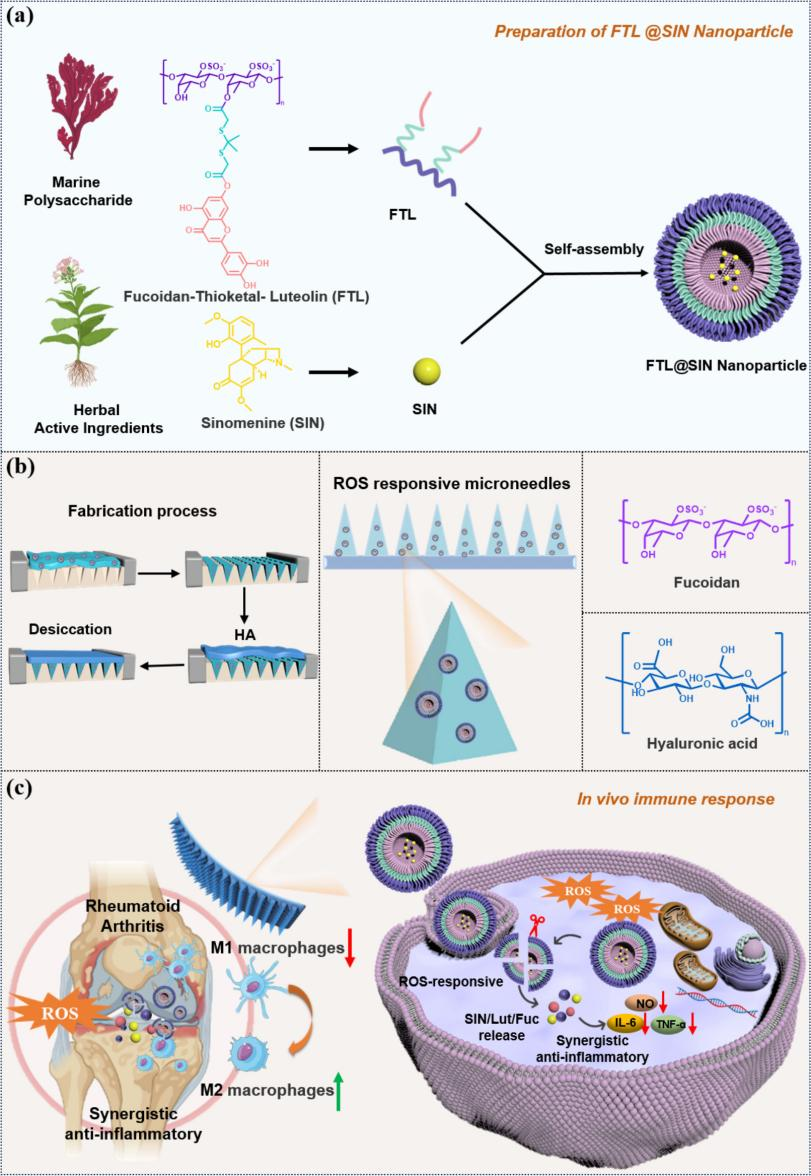 近期,煙臺大學陳大全教授團隊,針對目前類風濕關節炎治療存在的弊端和從中藥組分中得到啟發,選擇了具有免疫抑制活性的生物堿類化合物分青藤堿(Sinomenine,SIN)作為模型藥物,將中醫藥理論、納米醫學與微針經皮遞藥系統相結合,構建了活性氧(ROS)響應型納米顆粒與可溶性海洋載體微針聯用的新型經皮給藥遞送系統(FTL@SIN MNs)。選擇海洋中藥昆布組分—巖藻多糖(Fucoidan,Fuc)為親水骨架,以山東道地中藥金銀花組分木犀草素(Luteolin,Lut)為疏水端,并引入ROS響應型的硫縮酮鍵(Thioketal,TK)得到兩親性載體材料FTL。利用透析法將低水溶性藥物SIN包封于FTL的疏水內核中,得到載藥納米顆粒FTL@SIN,并將其負載到以高分子量的Fuc為主要基質,采用真空澆鑄法制備可溶性微針中,從而賦予可溶性微針ROS響應能力,最終得到新型經皮給藥遞送系統FTL@SIN MNs。顯著降低了巨噬細胞炎癥,同時減少了關鍵的促炎細胞因子,并將 M1 型重新極化為 M2 型,從而改善了滑膜炎癥,促進了軟骨修復(圖1)。該研究為類風濕性關節炎的治療干預提供了一條有前途的方法。