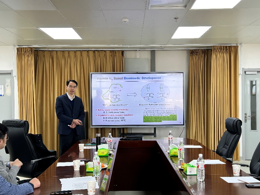 趙寶國教授做了提為“基于維生素B6的仿生不對(duì)稱催化”的學(xué)術(shù)報(bào)告。針對(duì)基于維生素B6的仿生催化反應(yīng)的發(fā)展歷程、目前面臨的問題、團(tuán)隊(duì)近年來的探索三個(gè)方面進(jìn)行了分享。重點(diǎn)介紹了基于輔酶維生素B6的骨架發(fā)展的多種手性吡哆醛、吡哆胺催化體系。以手性吡哆醛/吡哆胺為催化劑,實(shí)現(xiàn)了羰基仿生不對(duì)稱轉(zhuǎn)氨化,以極高對(duì)映選擇性合成了各種α-氨基酸、多肽和三氟甲基胺等手性胺類化合物。并對(duì)反應(yīng)的探索過程進(jìn)行了詳細(xì)分享。報(bào)告結(jié)束后,趙寶國教授與在場(chǎng)師生展開探討交流,現(xiàn)場(chǎng)氣氛熱烈活躍。