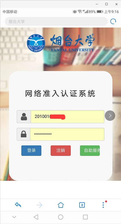校園無線采用web認證,連接YTU后,打開瀏覽器會自動轉到下圖所示的認證頁面(有的瀏覽器不允許自動轉到認證頁面,這時需要手工在瀏覽器中打開煙臺大學官網http://www.uzzweb.xyz,點擊右下角的“計費系統”);