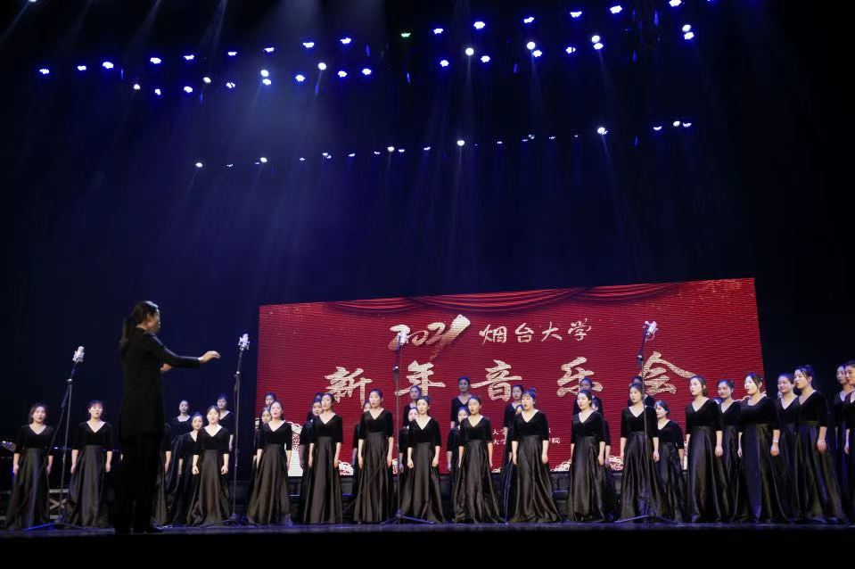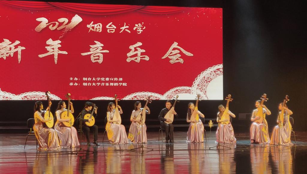 下半場,煙臺大學音樂舞蹈學院的師生們通過管弦交響樂、女生合唱、鋼琴獨奏、鼓樂合奏、男女聲獨唱和多重唱、琵琶阮重奏等多種音樂表現形式,為現場觀眾獻上了一場充滿家國情懷的新年音樂會。