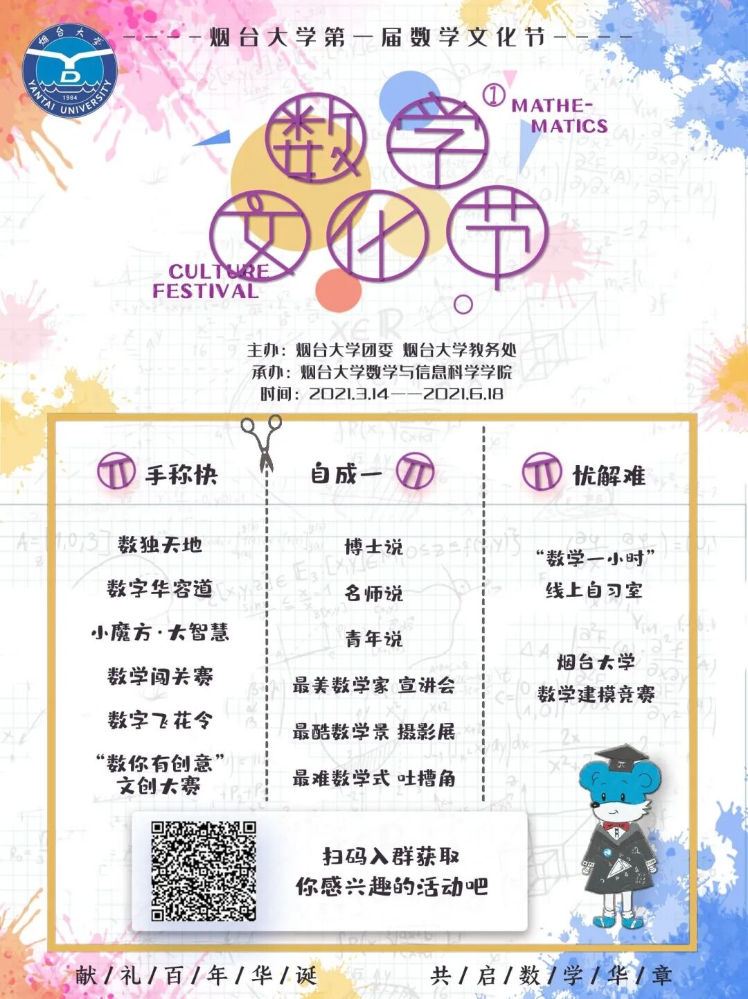 煙臺大學第一屆數學文化節以“獻禮百年華誕,共啟數學華章”為主題,旨在通過3大模塊、14項子活動宣傳數學文化、發揚數學精神、傳播數學之美。具體活動安排如下: