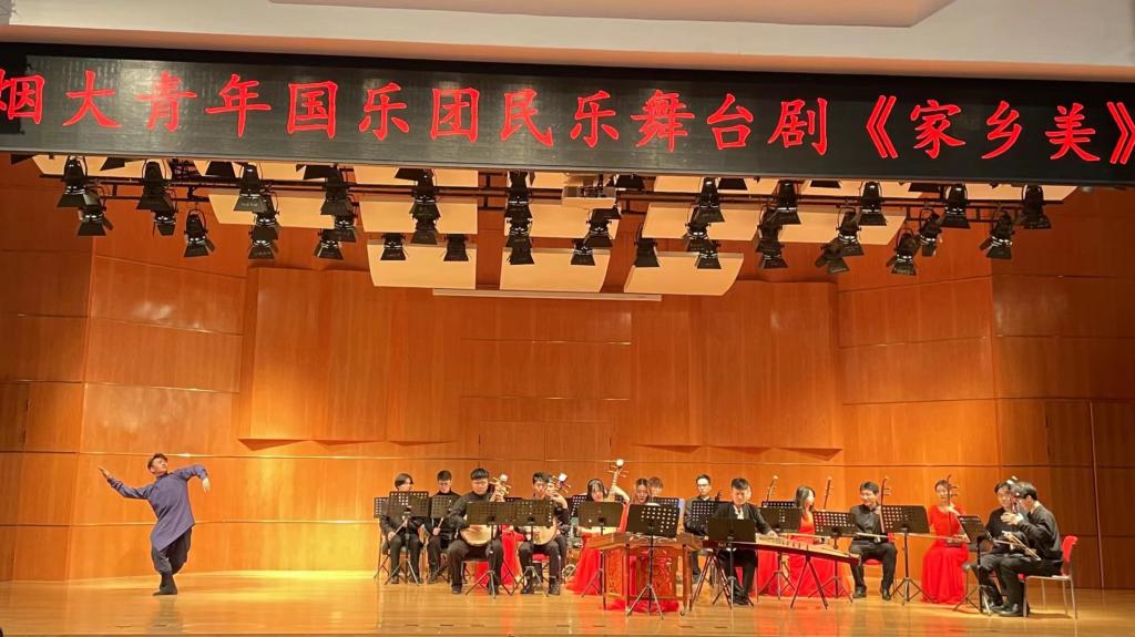 “該舞臺劇是煙臺大學一流課程《樂隊排練》、煙臺大學思政精品項目《煙大青年國樂團舞臺劇之融創研究》的階段性成果,在師生們齊心協力的磨合、排演、探索中,民樂合奏‘舞臺劇化’研究進入新階段。”談及此次演出,樂團指揮老師姚金佳說:“節目用‘說家鄉,道家鄉’的方式,對全國各地頗具代表性的曲目進行編曲、串聯,民樂演奏中融入聲樂、舞蹈、話劇元素。節目中還包含了用方言介紹家鄉文化、樂曲淵源等內容,不僅烘托了現場氣氛,而且讓觀眾領略了方言的文化魅力。”