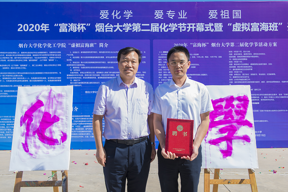 煙臺大學化學節(jié)由教務(wù)處、研究生處、社科(科技)處、黨委學工部(處)、校團委主辦,化學化工學院承辦,生命科學學院、藥學院、環(huán)境與材料科學學院、海洋學院、音樂舞蹈學院協(xié)辦,今年已是第二屆。在化學節(jié)開幕式上,校黨委書記張偉、校長郭善利、富海集團郭元山共同用化學顯色反應(yīng)的方式為本屆化學節(jié)揭幕,充分展現(xiàn)化學的神奇之處。隨后,舉行了煙臺大學化學化工學院“虛擬富海班”開辦儀式。校長郭善利老師先后為富海集團郭元山先生和富海集團朱相濱先生、化院專業(yè)教師翁永根老師和化院團委陳俊羲老師頒發(fā)“煙臺大學大學生就業(yè)導(dǎo)師”聘書及“‘虛擬富海班’導(dǎo)師”聘書。