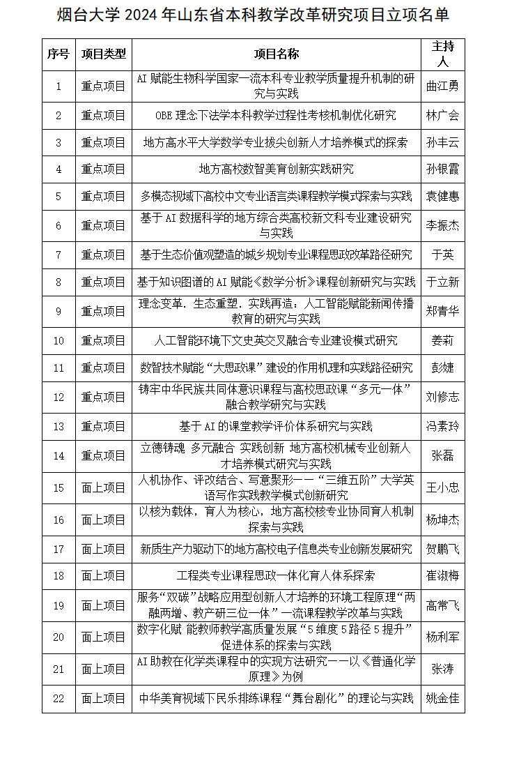 【本站訊】近日,山東省教育廳公布了2024年本科教學改革研究項目立項名單,煙臺大學獲批22項,其中重點項目14項、面上項目8項,立項數量再創新高,位居省屬高校前列。這是學校堅持不懈抓教育教學、不斷進行理論與實踐探索的結果,也是學校高度重視人才培養、狠抓專業內涵建設、努力提升人才培養質量的集中體現。