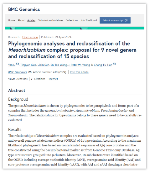 相關研究成果以“Phylogenomic analyses and reclassification of the Mesorhizobium complex: proposal for 9 novel genera and reclassification of 15 species”為題,在基因組及生物信息學領域頂級期刊《BMC Genomics》上發表。該研究近日正式獲得國際微生物系統委員會認可,研究團隊提出的9個新屬已全部列入原核微生物分類名錄。