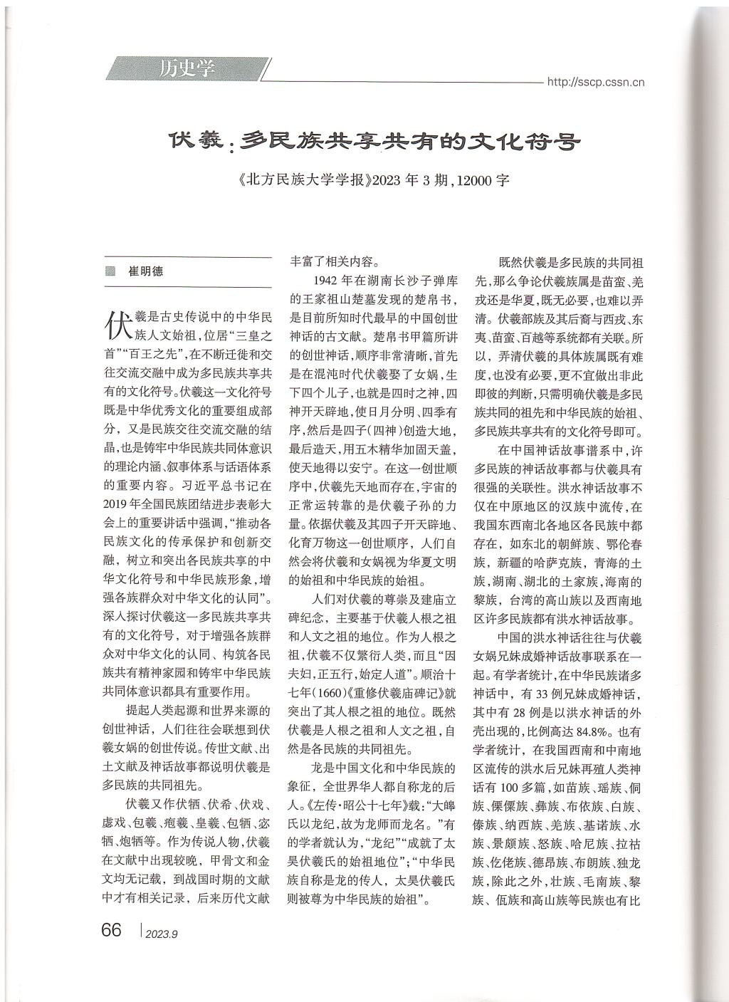 近日,《中國(guó)社會(huì)科學(xué)文摘》2023年第9期主體轉(zhuǎn)載了煙臺(tái)大學(xué)崔明德教授發(fā)表于《北方民族大學(xué)學(xué)報(bào)》2023年第3期的理論文章《伏羲:多民族共享共有的文化符號(hào)》。