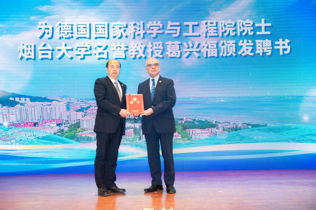 會上,煙臺大學黨委書記盧國強分別與貝奇科夫團隊成員尤金、精準材料高等研究院朱禮龍為院士工作室和高層次人才工作站揭牌。煙臺大學黨委副書記、校長郝曙光為貝奇科夫、葛興福、殷福星頒發聘書。